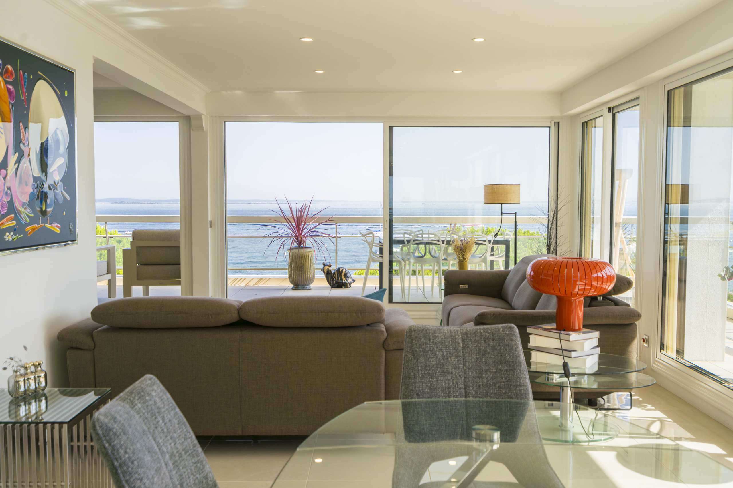 - Grande pièce de vie vue mer, avec Baies-vitrées sur toute la longueur de l'appartement, salon, canapé, Télévision & espace repas