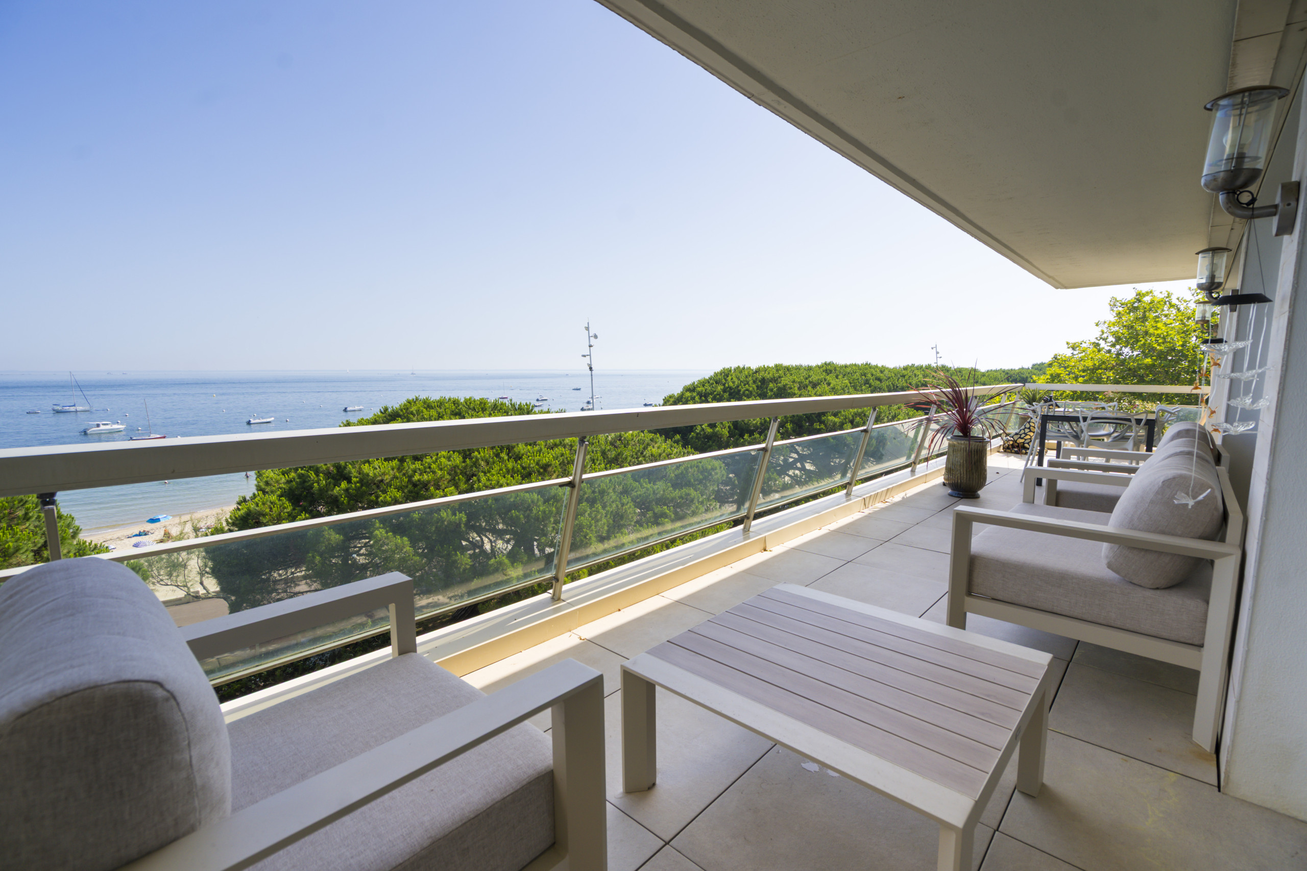 - Grand Balcon s'étendant tout le long de l'appartement, offrant une vue imprenable sur le Bassin, table à manger, transat, salon d'extérieur & chaises longues