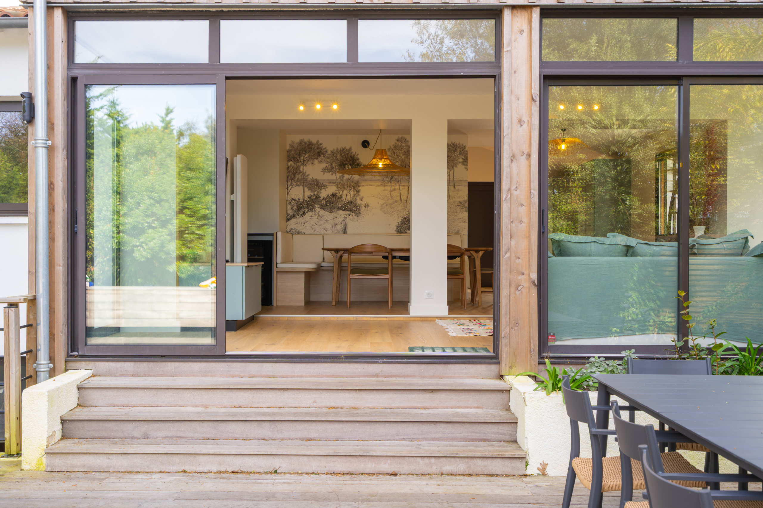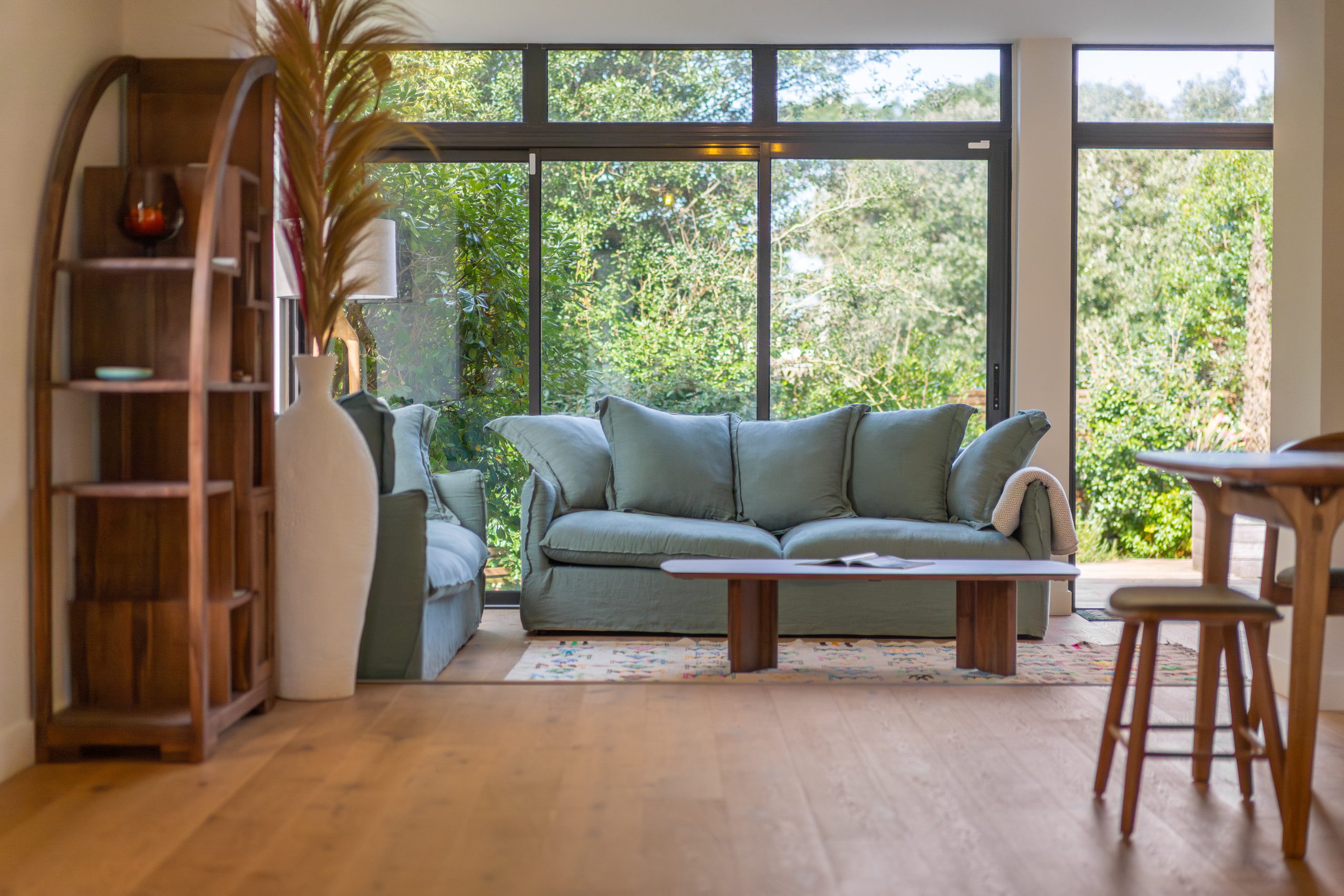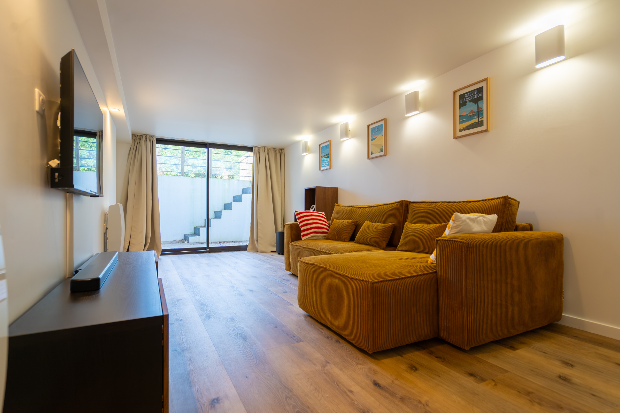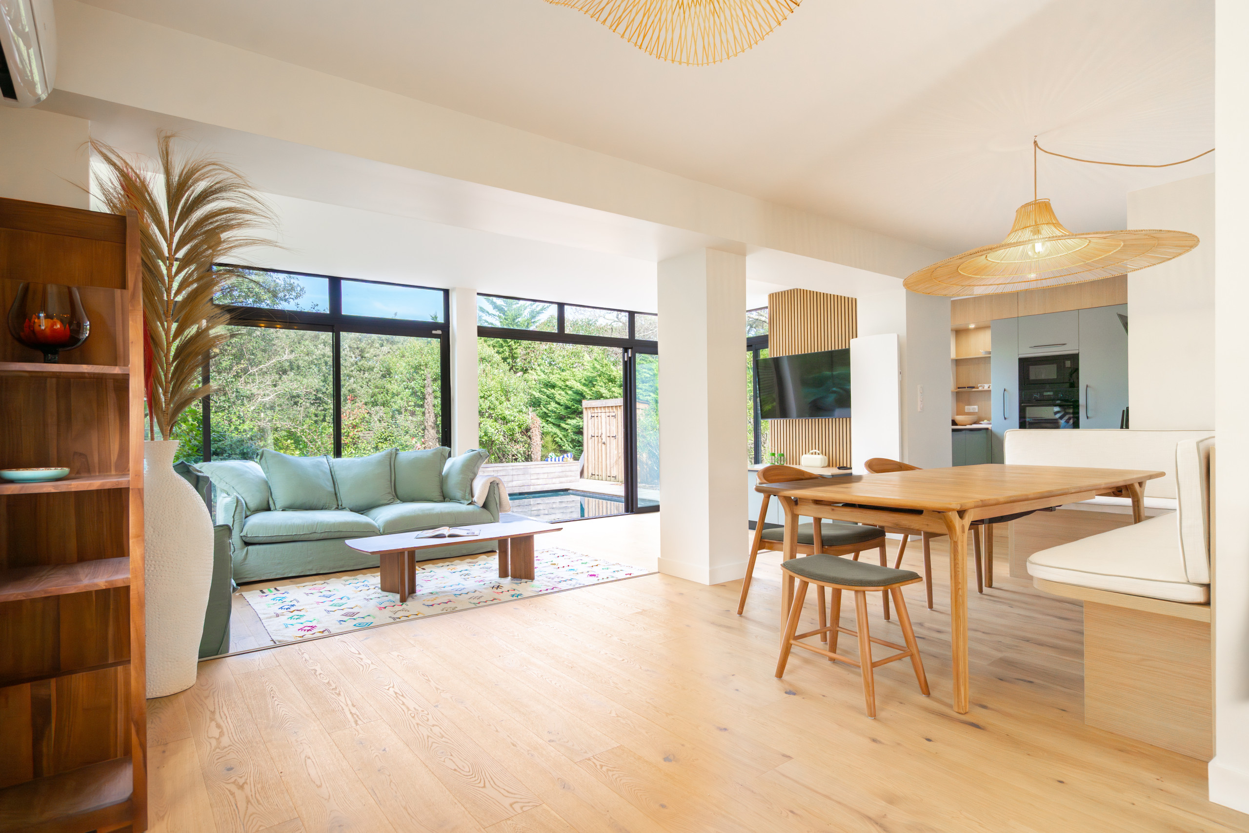 - Salon ouvert sur l’extérieur, canapé, Tv