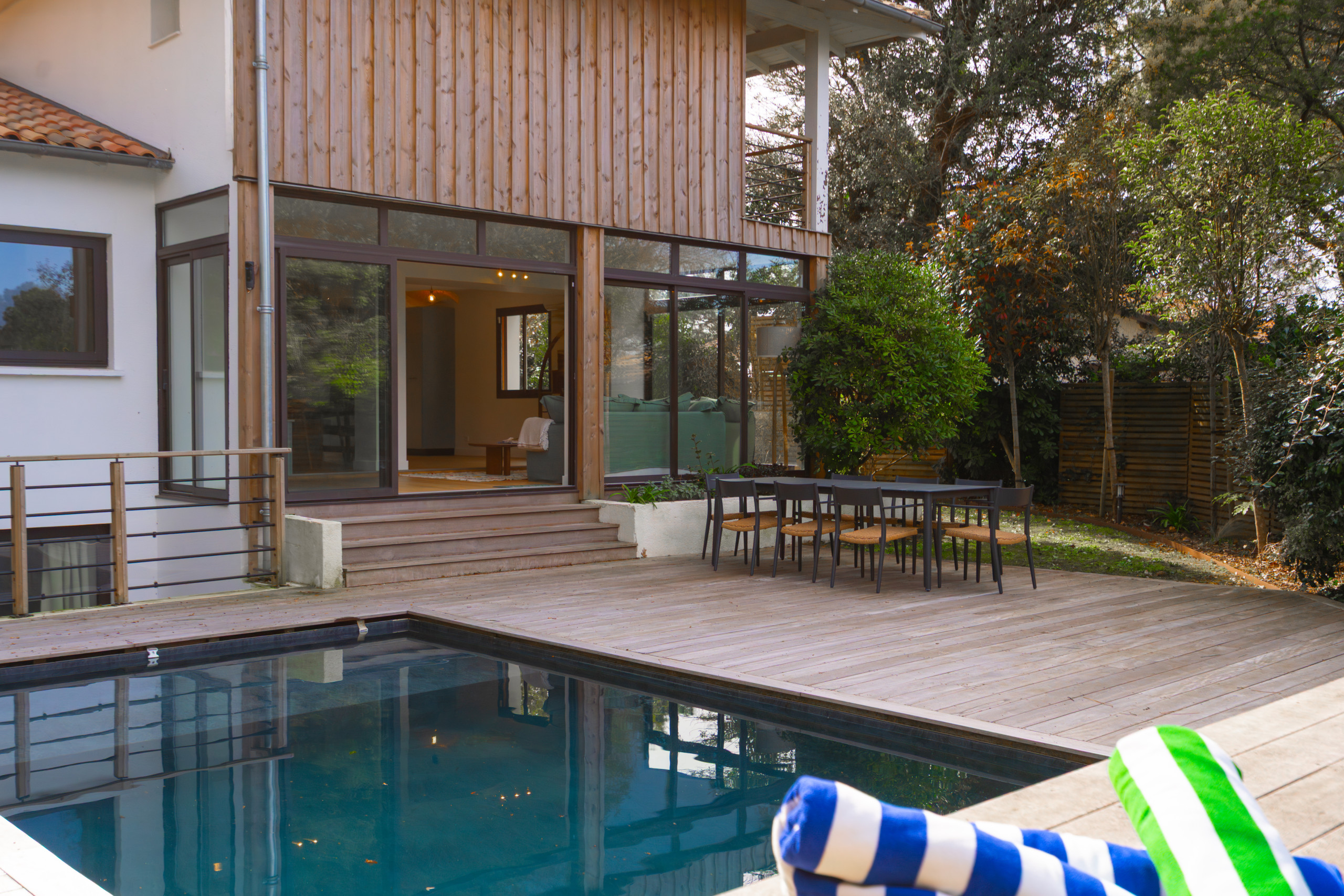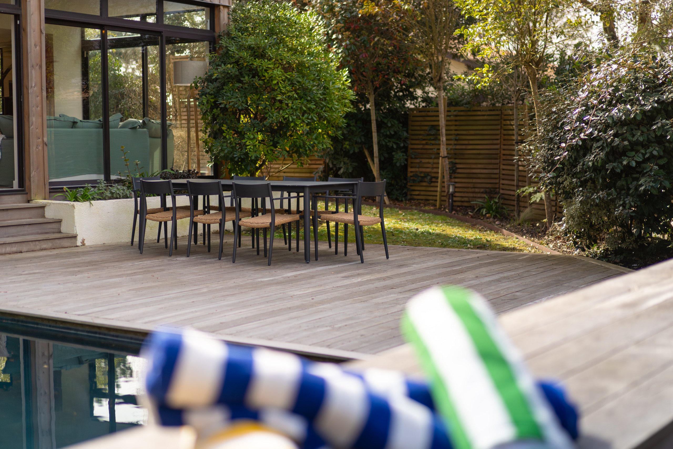 - **Transats, salon de jardin**, espace repas avec Plancha
