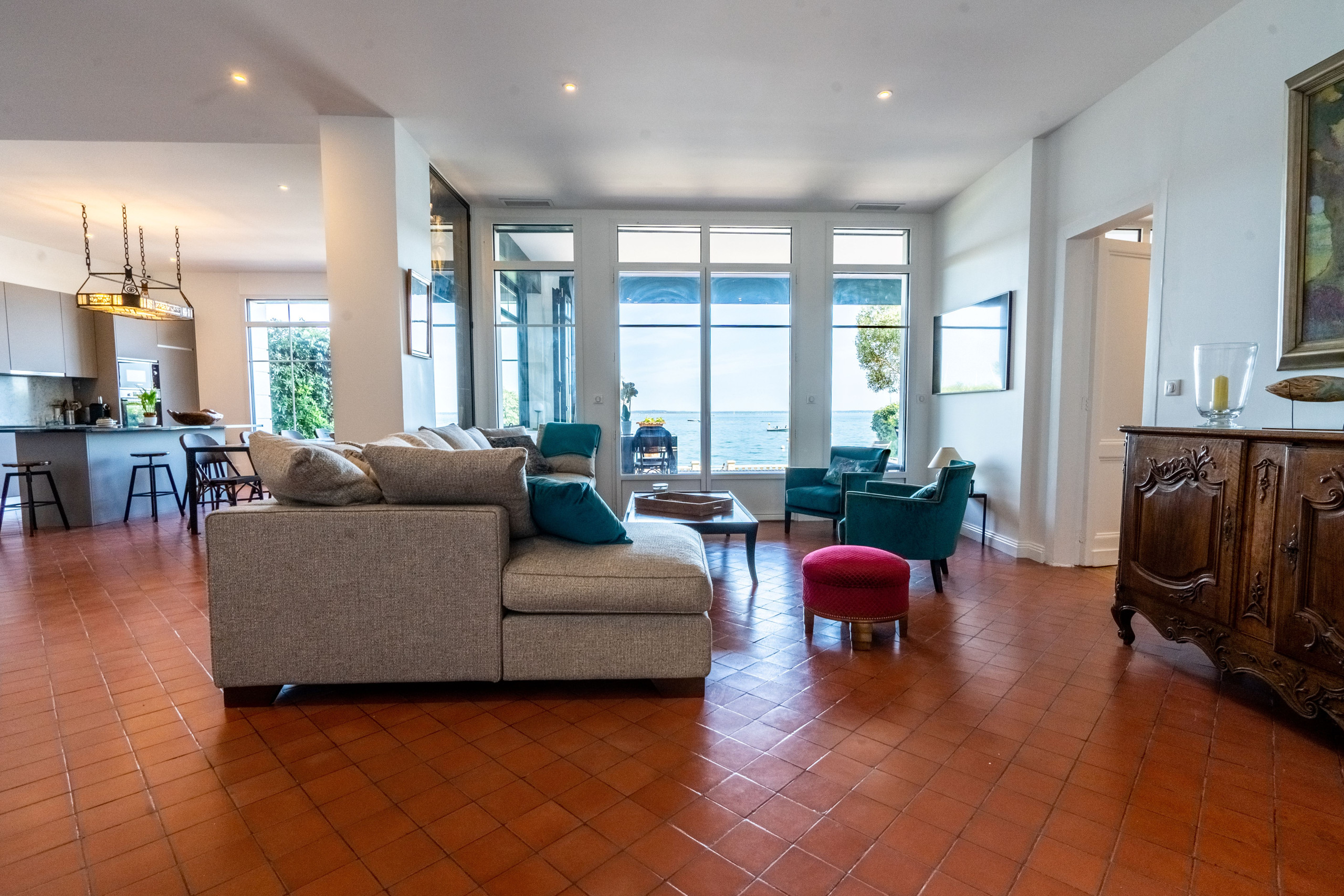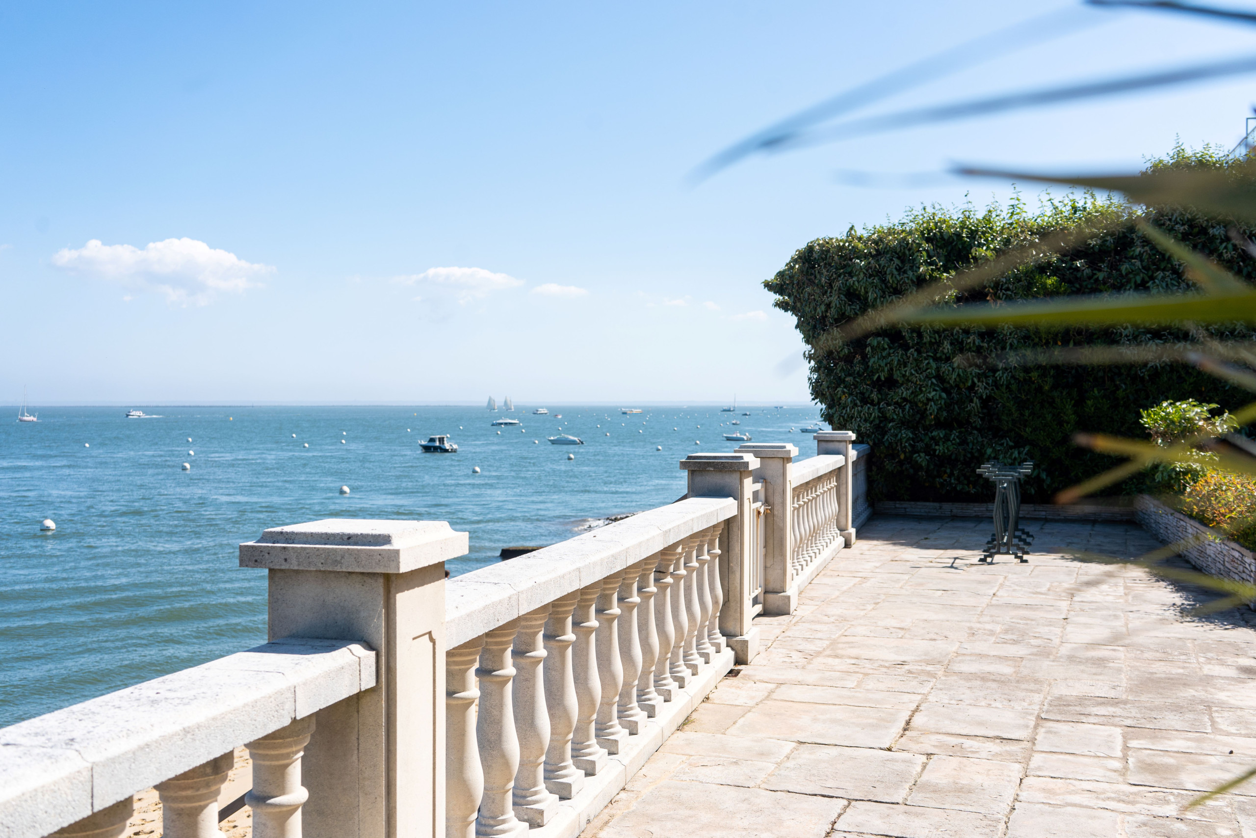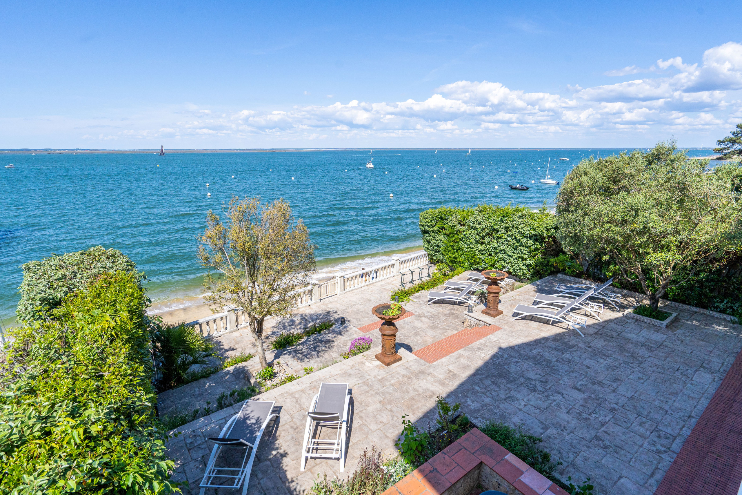 On the Garden Level, 4 suites including one with Basin view, large Living Room overlooking the seafront, fully equipped open kitchen, (back kitchen ideal for a chef's arrival). Winter garden fully openable, terrace on 3 levels with garden furniture and private beach access.