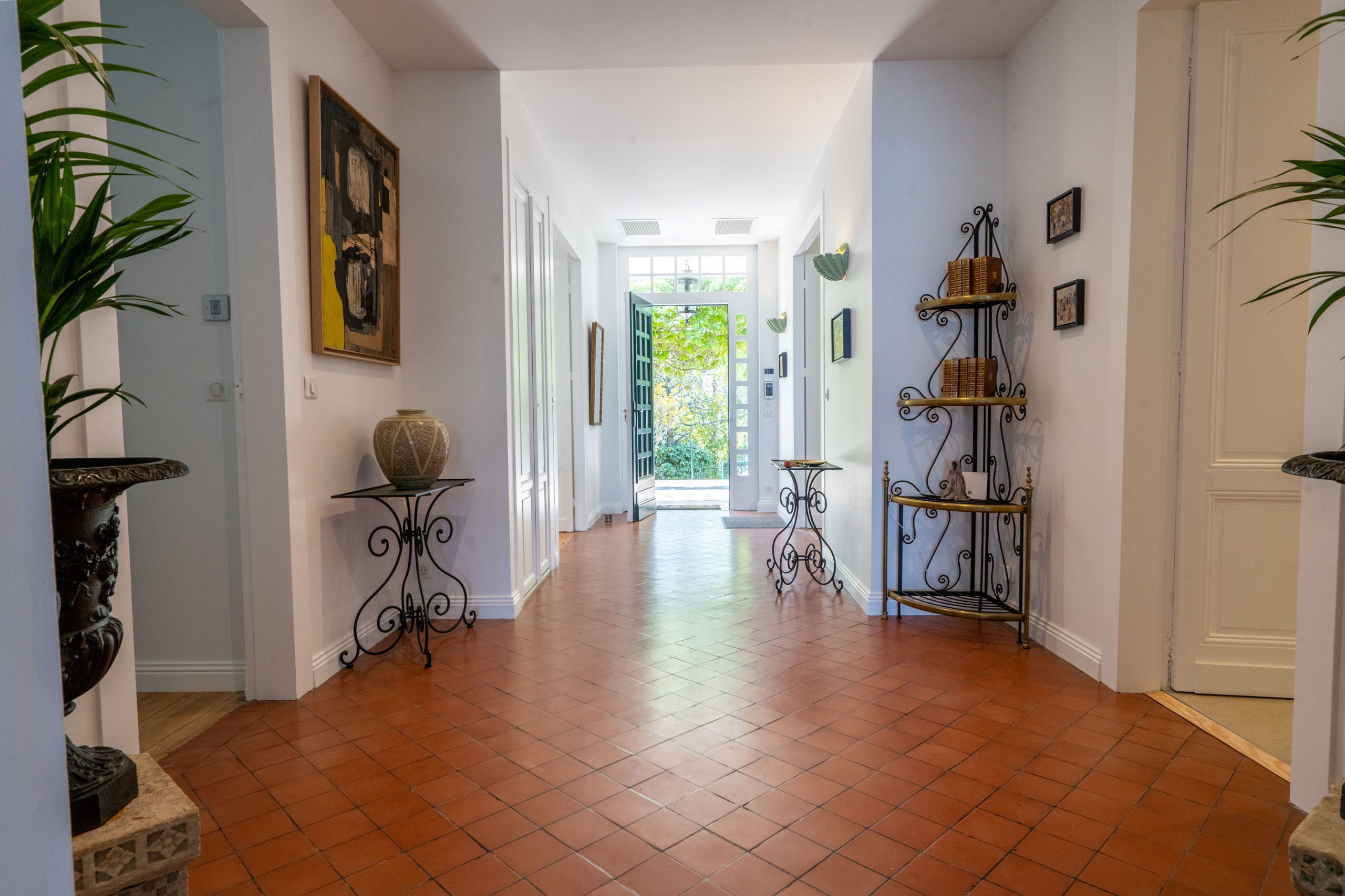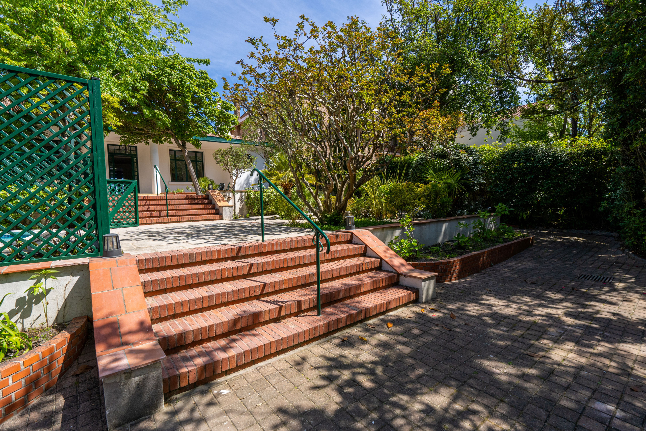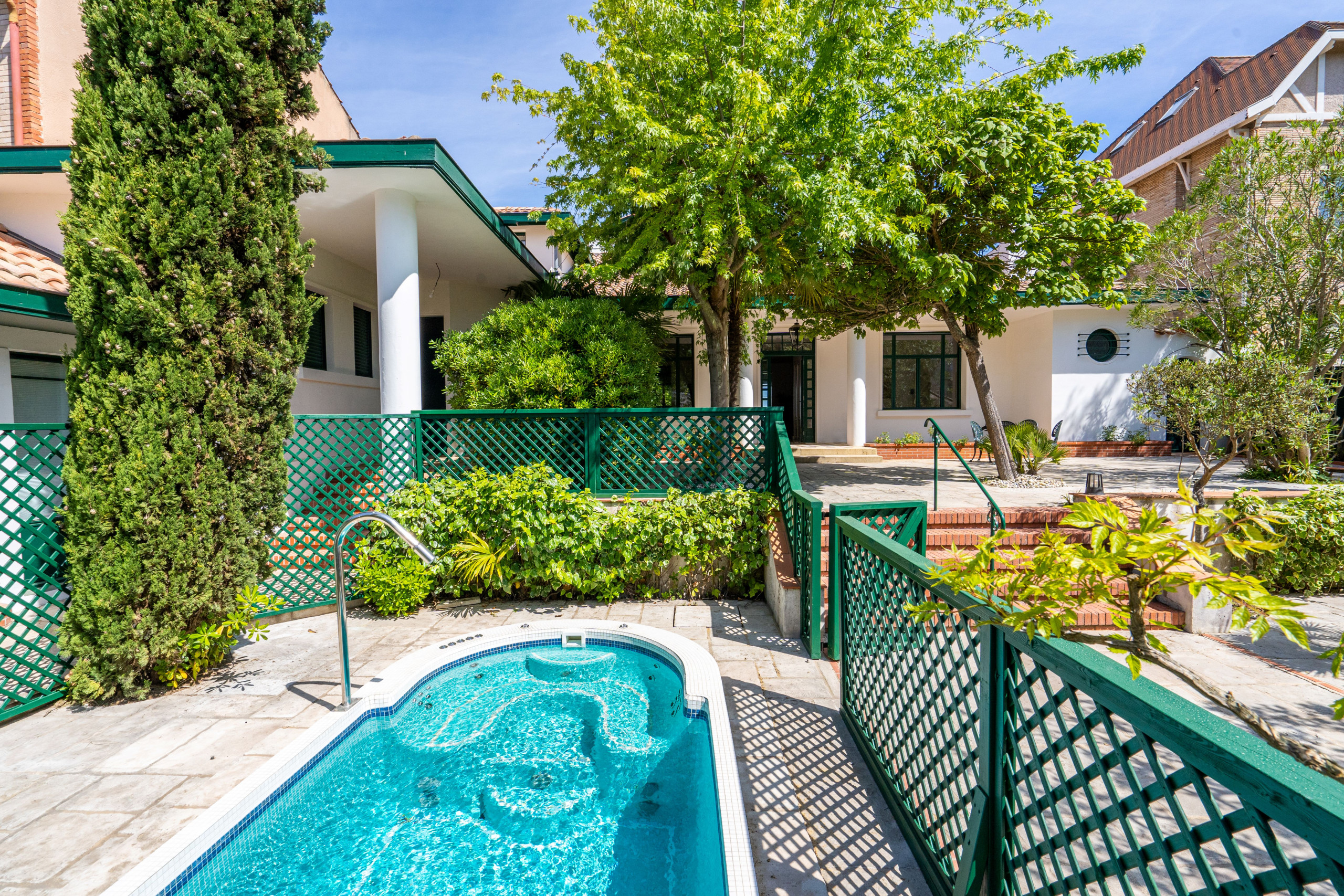 At the entrance, you will discover the inner courtyard where you can easily park 4 vehicles, a tree-lined garden with a heated Bath/Jacuzzi.